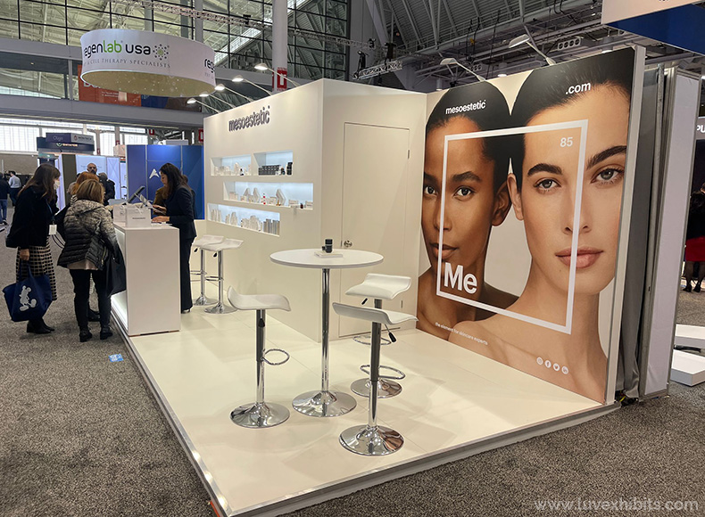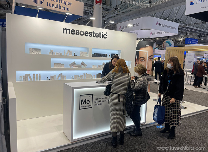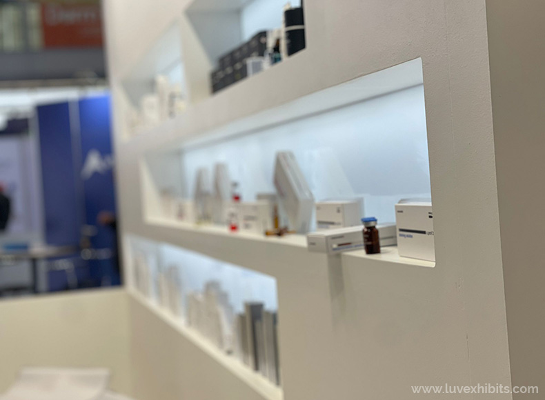 Cette année, la conception du stand a subi quelques ajustements par rapport aux stands précédents ; Les murs étaient entièrement blancs, les niches pour exposer les produits avaient une disposition irrégulière et sur la droite se trouvait un grand graphique de la marque.